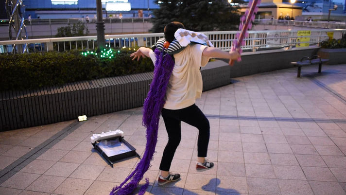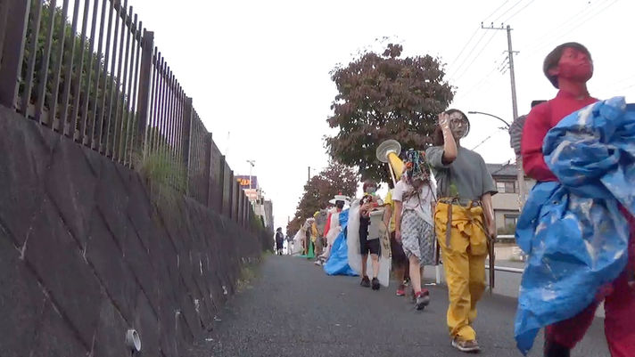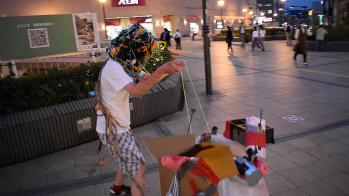 を経た後、参加者全員でゴミやスクラップを持ち寄り、身にまとう儀礼服を制作。最終日には大学から橋本駅までをめざして儀礼服を着て歩行。駅のロータリーを全員で囲んだ後、2分間の通過儀礼を行った。